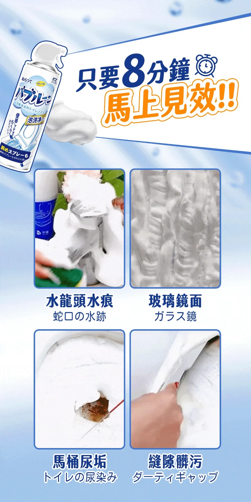 20分鐘前雪泡淨浴廁清潔慕斯 ,馬桶不刷也能亮 , 浴室清潔一瓶搞定 - 【買五送三】【MokoClean雪泡淨】8入組,團購好友分享 免運 NT$1299